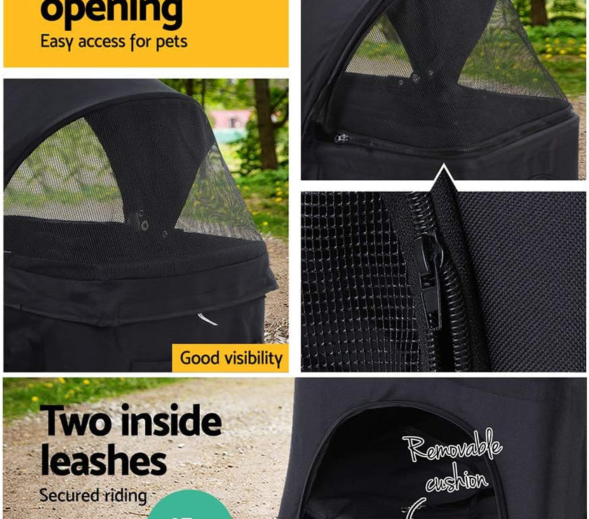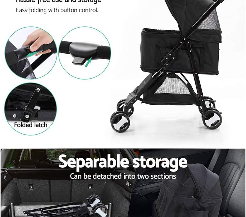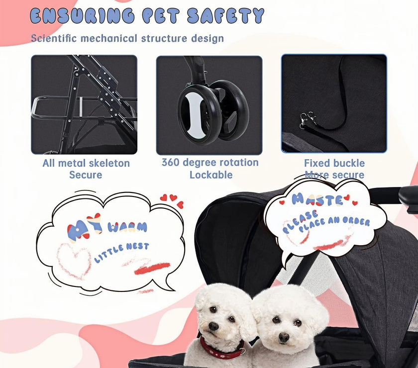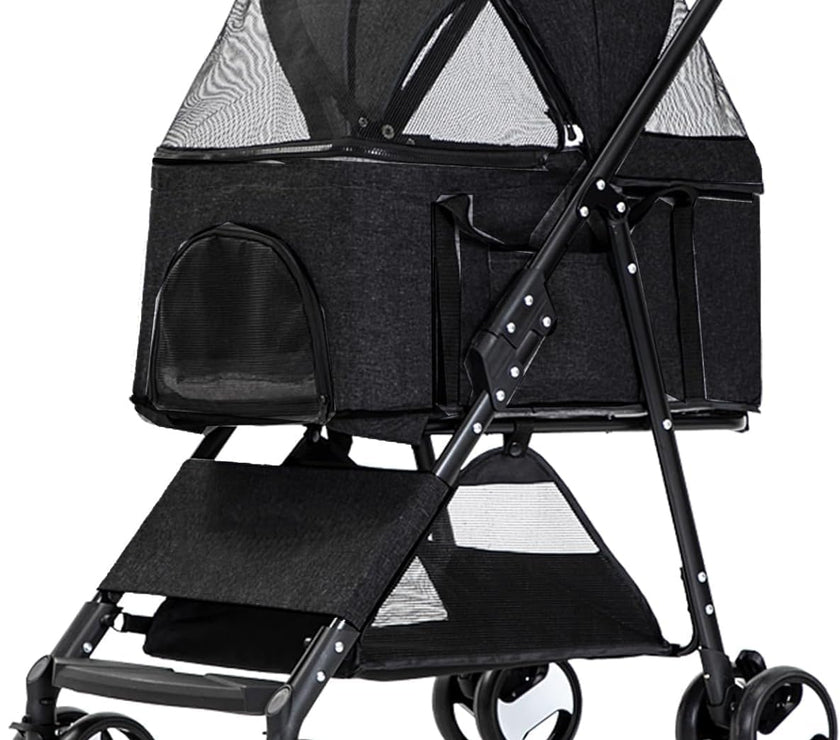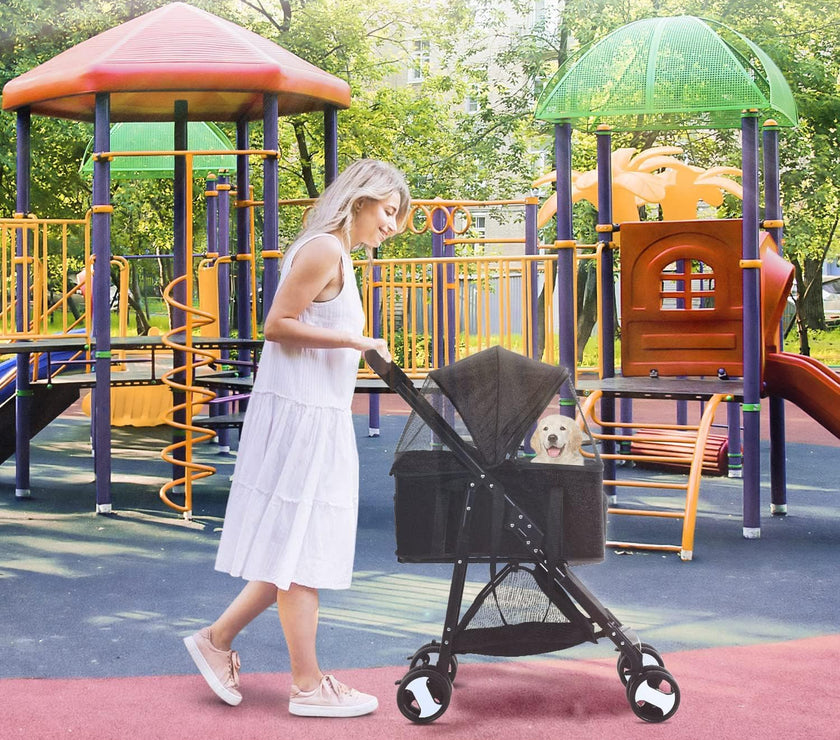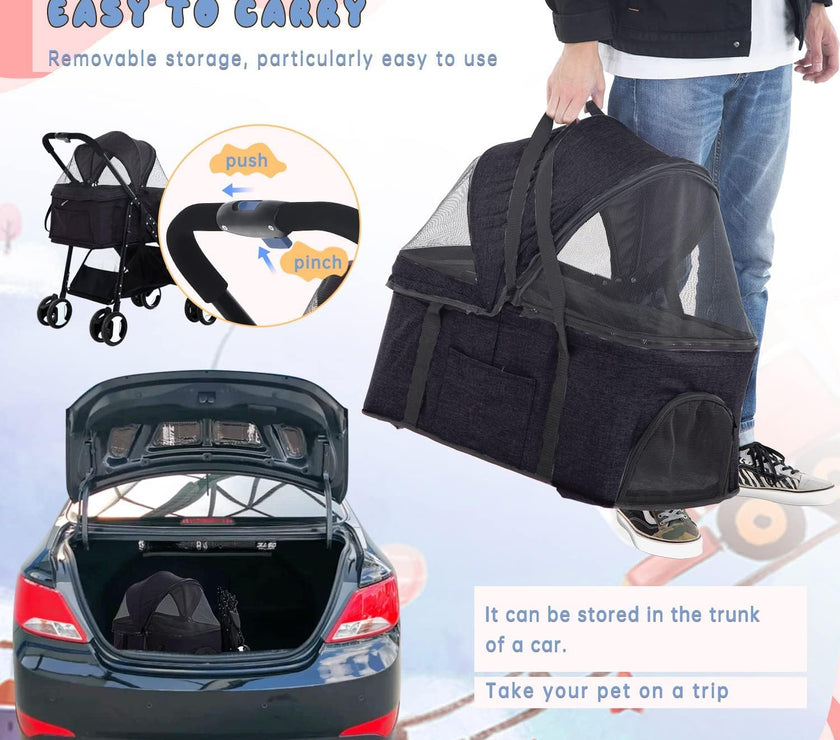 With its four smooth-rolling wheels, this stroller provides a smooth and stable ride for your beloved companion. Whether you're strolling through the park or taking a leisurely walk in the neighborhood, the sturdy construction and secure harness system keep your pet safe and secure throughout the journey.